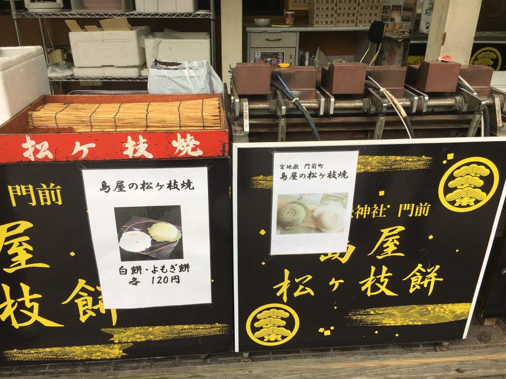 訪れたのは「島屋」。アツアツの松ヶ枝餅二つに、白餅とよもぎ餅を購入。