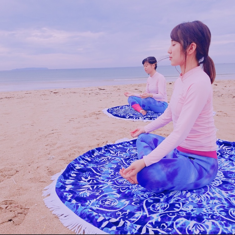 まずは、砂浜でウォーミングアップ&SUP YOGAの基本を学ぶ。