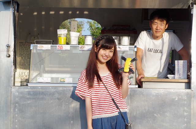 第二会場では、糸島の人気ジェラート屋さんの裏スペースでトイドローンを使って、お菓子釣り体験を開催しました。また、DJIアンバサダー河村友歌さんによるDJI新商品の『Spark』の飛行デモもおこなわれました。