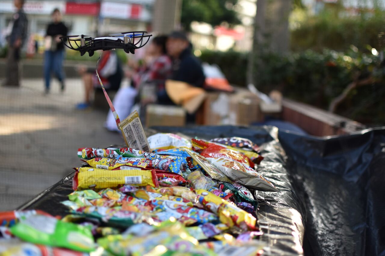 ドローンお菓子釣り体験はMAMBOというトイドローンに磁石をとりつけ、お菓子にクリップをつけ、磁力でお菓子を吊り上げるというUFOキャッチャーのドローンバージョンです!