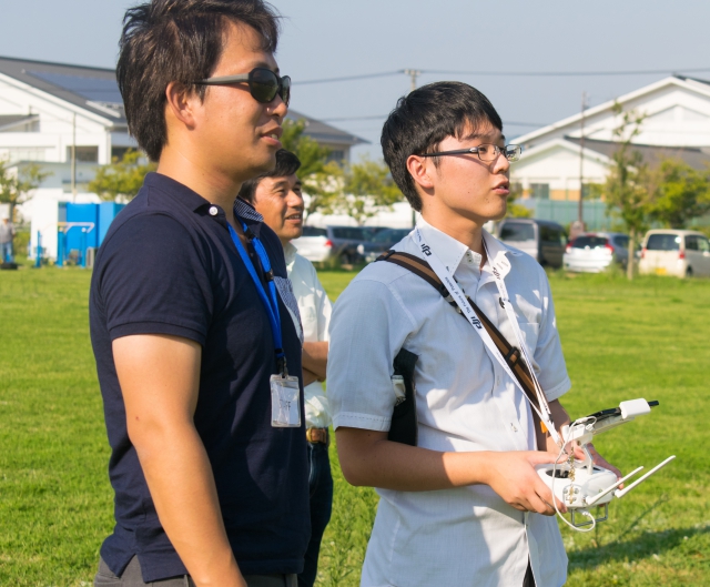 そして唐津ビジネスカレッジ近くの松浦河畔公園に移動。トイドローンより格段に大きな、Inspire、Phantom、SparkやMavicといったドローンの操縦体験を行いました。