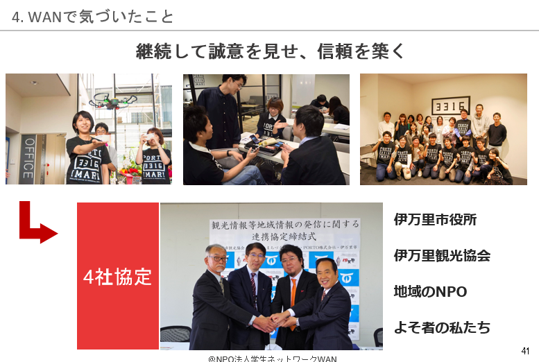 そして、先日は、伊万里市役所、伊万里観光協会、NPO法人まちづくり伊萬里、そして「ヨソモノ」であるWANがプロジェクト連携しているPORTO株式会社で情報発信に関する4社協定を結ぶことができました。これは、「ヨソモノ」の私たちと一緒に地域の情報発信をしていくことを伊万里市が認めてくださったことを表します。信頼関係を築くためには地道な作業がとても重要なことを私は伊万里から学びました。