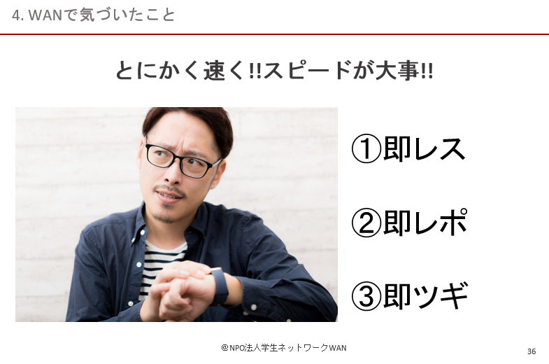 そのためにはある程度の時間を割く必要があると考えます。そして、少しの時間でもWANに時間をささげようという誠意を示し継続することが、自分の価値を評価してもらえ、結果的に自己の成長につながることを知っているからです。