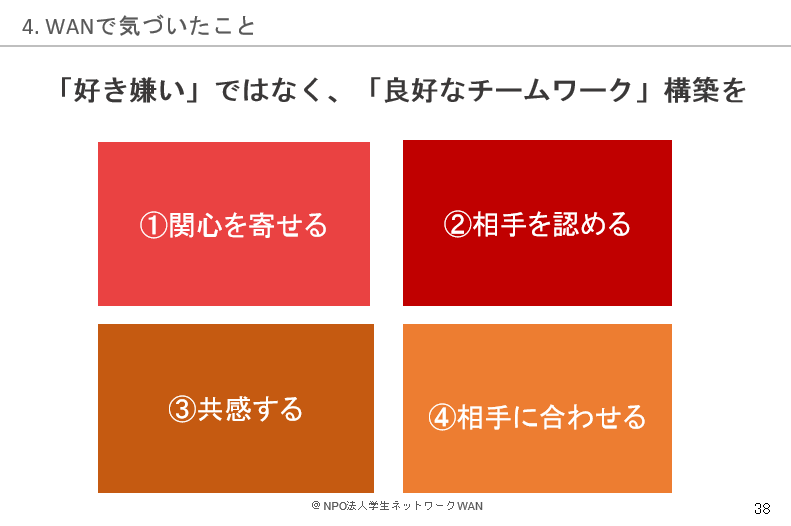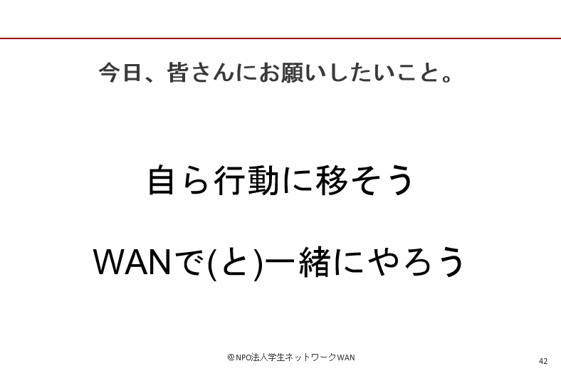それでも、少しでも挑戦する側になりたい人・不安を払拭したい人・自信をつけたい人はぜひ、WANで一緒に頑張りませんか?または、WANと連携して頑張りませんか?これが、私が皆さんに一つの選択肢であり、今日一番言いたかったことです。