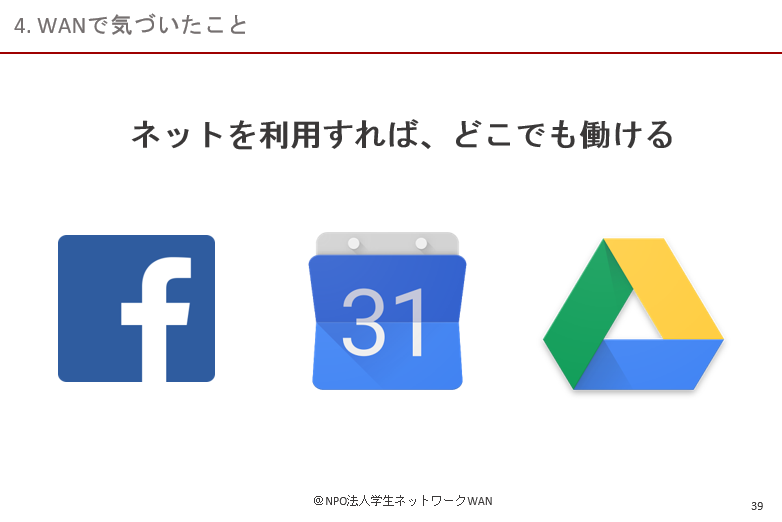 WANでは、Facebook、グーグルドライブ等のアプリを使いながら基本的にリモートで仕事をします。わざわざ出社する必要がありません。
