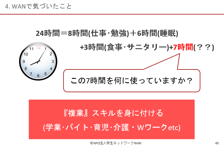 WANのメンバーは「複業」という考えのもと、学業とNPOの活動を両立することに挑戦しています。